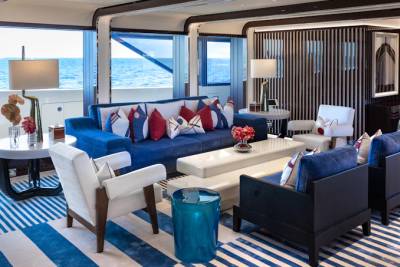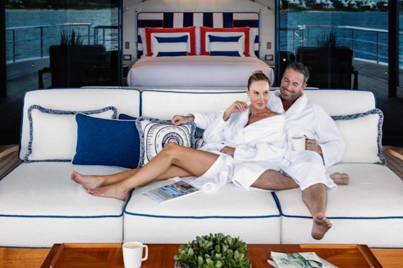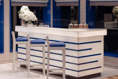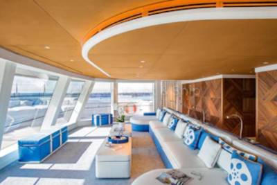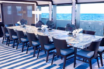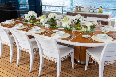 At the heart of CC-Summer’s social scene is the vibrant upper deck salon, a space designed for effortless elegance and relaxed gatherings. Anchored by a sleek bar and grand piano, this luminous lounge invites guests to sip, socialize, and unwind in style. Floor-to-ceiling windows flood the space with natural light, while plush seating areas provide the perfect setting for cocktail hours, live music, or quiet moments with a view. Just steps away, the alfresco dining area offers seamless indoor-outdoor flow, ideal for leisurely lunches or candlelit dinners under the stars.
